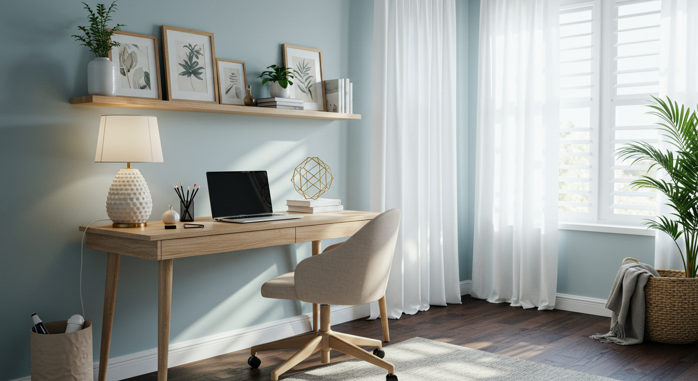 Declutter surfaces like the desk and shelves